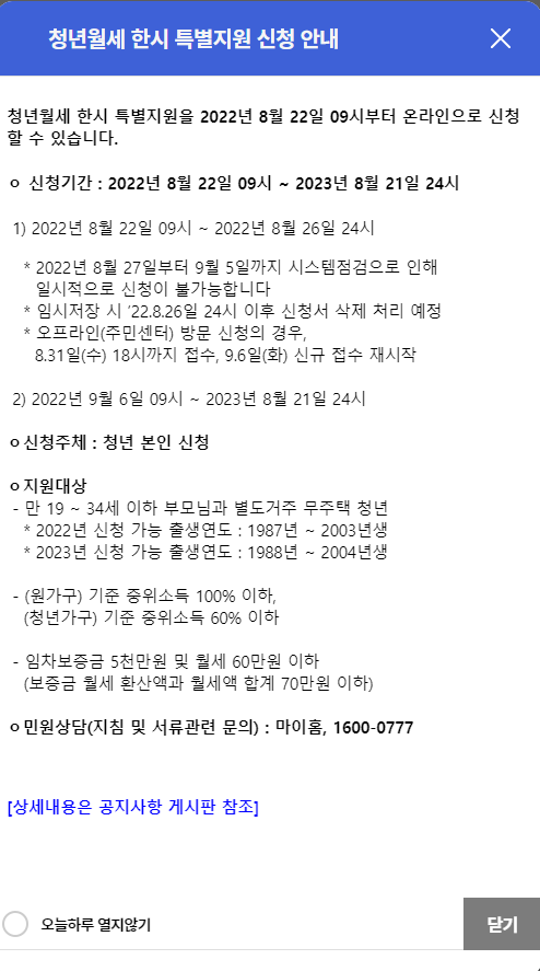 신청기간 및 지급시기: 2022년 08월 22일 오전09시 ~2023년 8월 21일 24시 까지 1년간 신청 가능 - 10월부터 소득.재산 요건 검증을 거쳐 11월부터 월세를 지급 - 8월 신청 시 10월 검토&대상여부 통보 후 11월에 신청한달인 8월꺼 까지 포함하여 8월~11월 분에 해당하는 4개월의 월세를 일시 본인 통장으로 지급 또는 9월 신청 시 11월에 9~11월달분의 월세를 일시 지급 대상: 조건 충족되는 만19세~34세 (39세까지 확대 지원할 예정이라고 함) 자격 조건: 1. 부모와 따로 거주하는 무주택자 .보증금 5,000만원 이하 .월세 60만원 이하인 주택 거주자 - 혹시 월세가 60만원 초과한다면 월세와 보증금의 월세환산액(보증금×2.5%+12개월)을 합한 금액이 70만원 이하면 지원가능 2. 청년 가구는 기준 중위 소득의 60% 이하(1인 가구 기준 월 117만원), 청년과 부모를 포함한 원가구는 기준 중위 소득의 100% 이하(3인 가구 기준 월 419만원) ![]() 3. 현재 가지고 있는 재산으로 청년 가구 1억700만원 이하, 원가구는 3억 8000만원 이하 [ 청년가구: 청년 본인, 배우자, 자녀를 말하며, 본인과 배우자의 부모, 형제자매 등의 다른 가족과 함께 거주하는 경우 해당 가족도 청년가구에 포함됨 / 원가구: 청년가구와 부모만 포함됨! ] 신청 방법: 복지로 홈페이지(www.bokjiro.go.kr) 와 마이홈(www.myhome.go.kr) 에서 본인이 해당하는지 확인 후 복지로 홈페이지나 앱에서 신청가능하며 오프라인으로 시.군.구청. 읍.면.동 행정복지센터에서 방문 신청 가능하다. 제외대상: - 방학 동안 일시적으로 부모님 댁으로 거주지를 이전한 경우에는 수급기간이 연속하지 않더라도 청년월세 특별지원 사업 시행 기간 내라면 12개월분의 월세를 모두 지원 받을 수 있다. - 군입대/ 90일을 초과하여 외국에 체류, 부모와 합가, 전출 후 변경신청 누락 등의 경우 월세지원이 중지됨 - 월세연체, 주민등록말소, 거주불명 등록, 사망 또는 지원 거부 등의 경우에도 중지됨 |