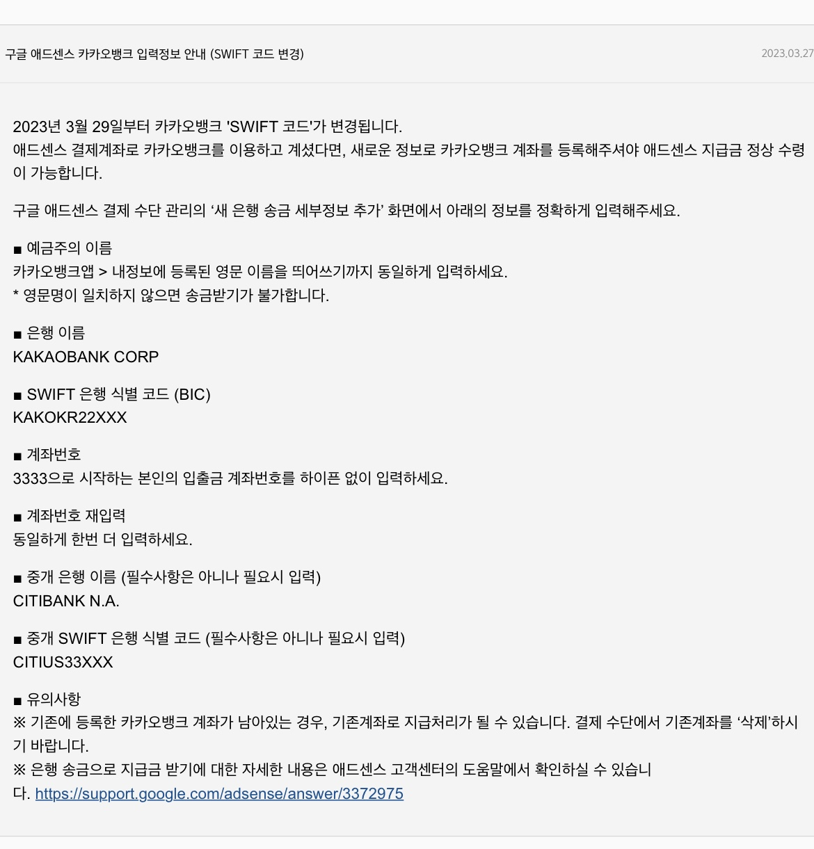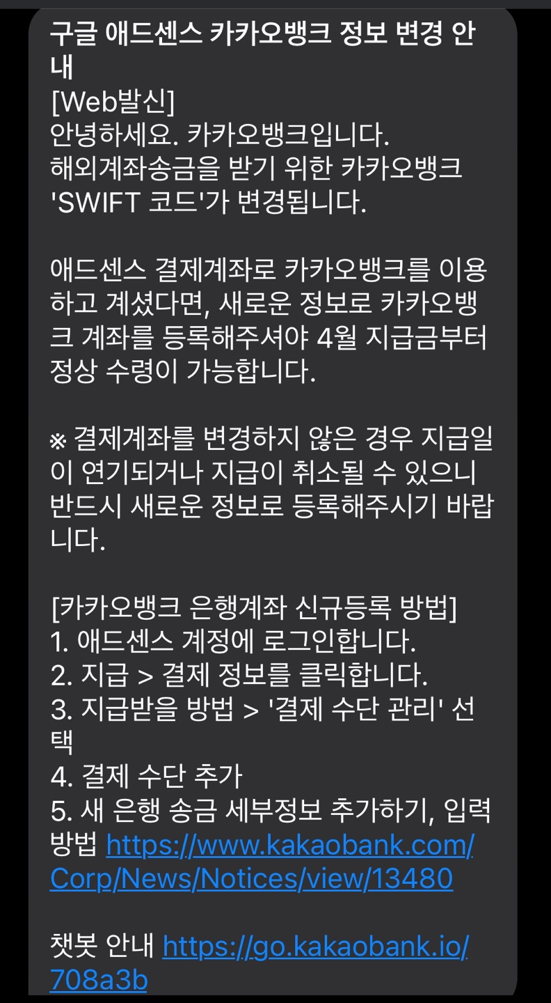 몇 일전 카카오뱅크에서 구글 에드센스 결제계좌로 연결한 카카오뱅크 SWIFT정보가 변경되었단 문자를 받았다.