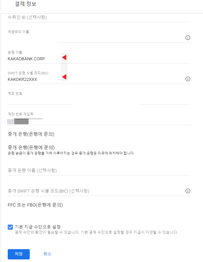 예금주명/ 계좌번호 기입해주고 화살표부분 은행이름/ SWIFT식별코드 명시대로 기입해주고 저장 하면 완료!!