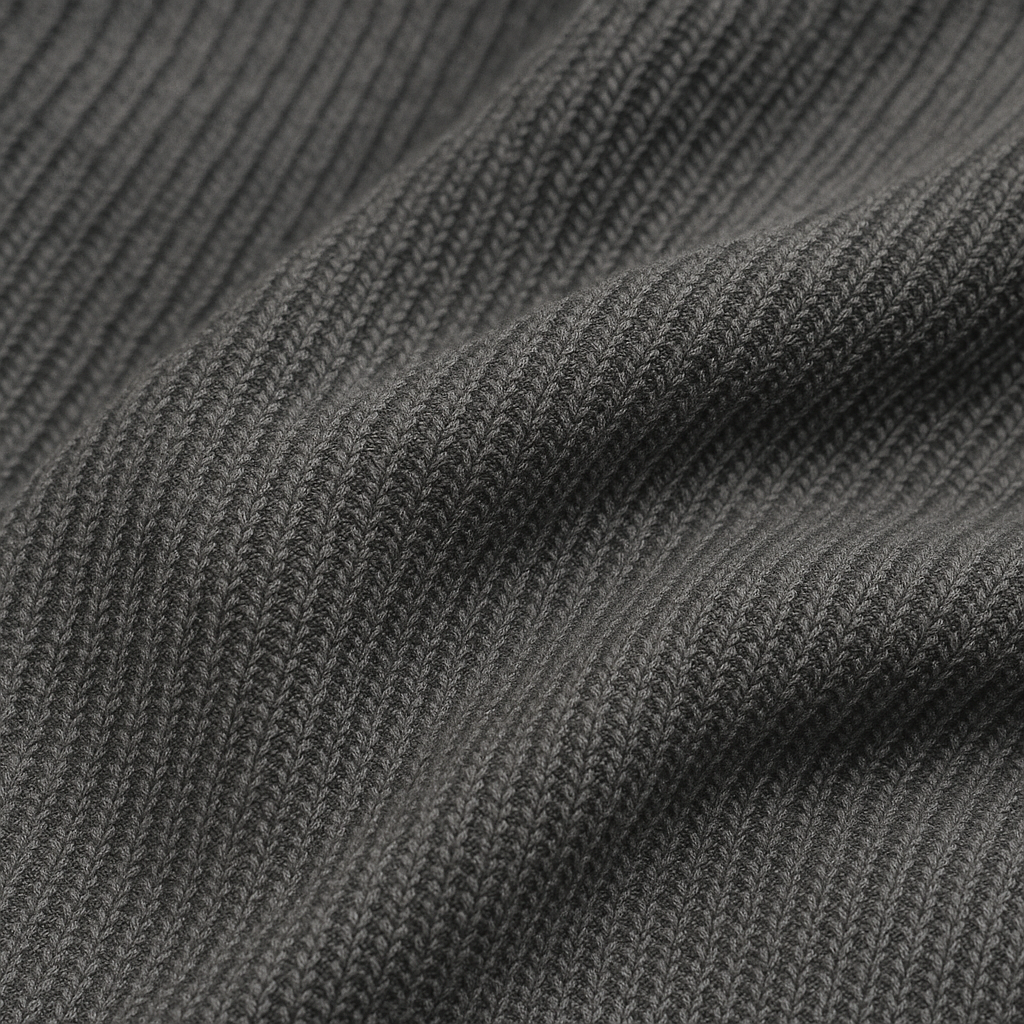 사카리바 원단은 앞면과 뒷면의 조직이 다르게 구성된 이중 구조의 니트 원단입니다. 앞면은 굵은 실로 낮은 게이지로 작업하여 리브(RIB)나 스웨터처럼 보이며, 뒷면은 싱글 원단처럼 높은 게이지로 작업되어 부드럽고 매끄러운 느낌을 줍니다.